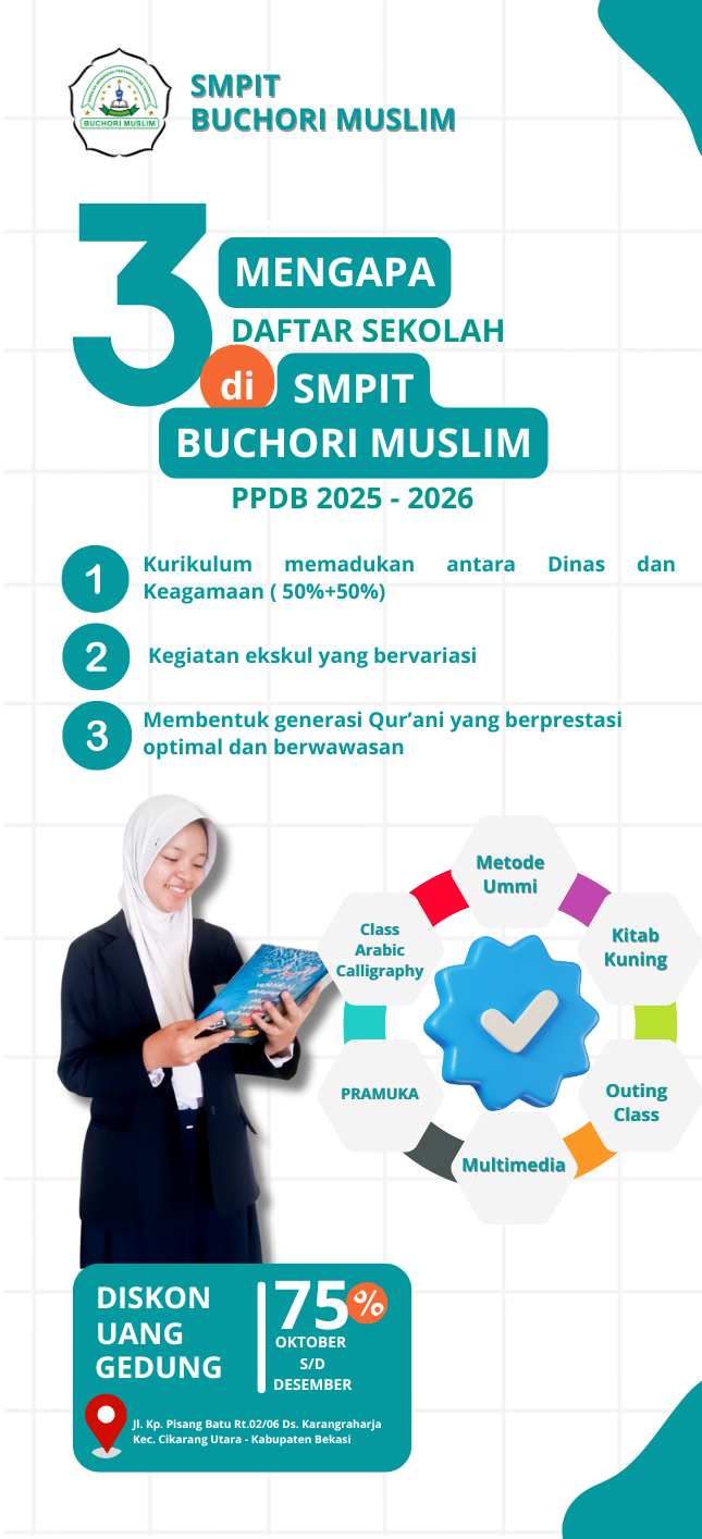 Mari bergabung bersama kami di SMPIT Buchori Muslim, tempat pendidikan Islami, unggul, dan berkarakter! Kami siap membimbing putra-putri Anda menjadi generasi yang cerdas, berakhlak mulia, dan siap menghadapi tantangan masa depan.